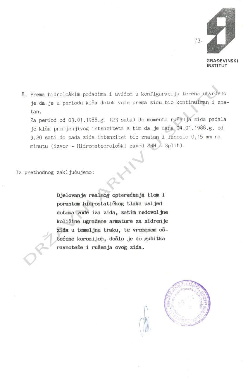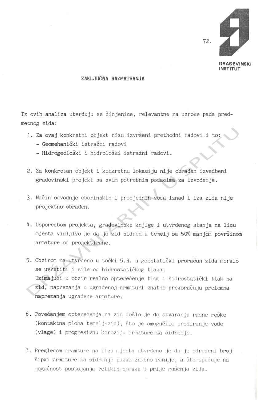 Zaključci struke dakle nisu bili laskavi ni po projektante ni po izvođače. Prema 'zaključnim razmatranjima' Građevinskog instituta, dokumentu pohranjenom u Državnom arhivu u Splitu, konstatirano je nekoliko činjenica.
