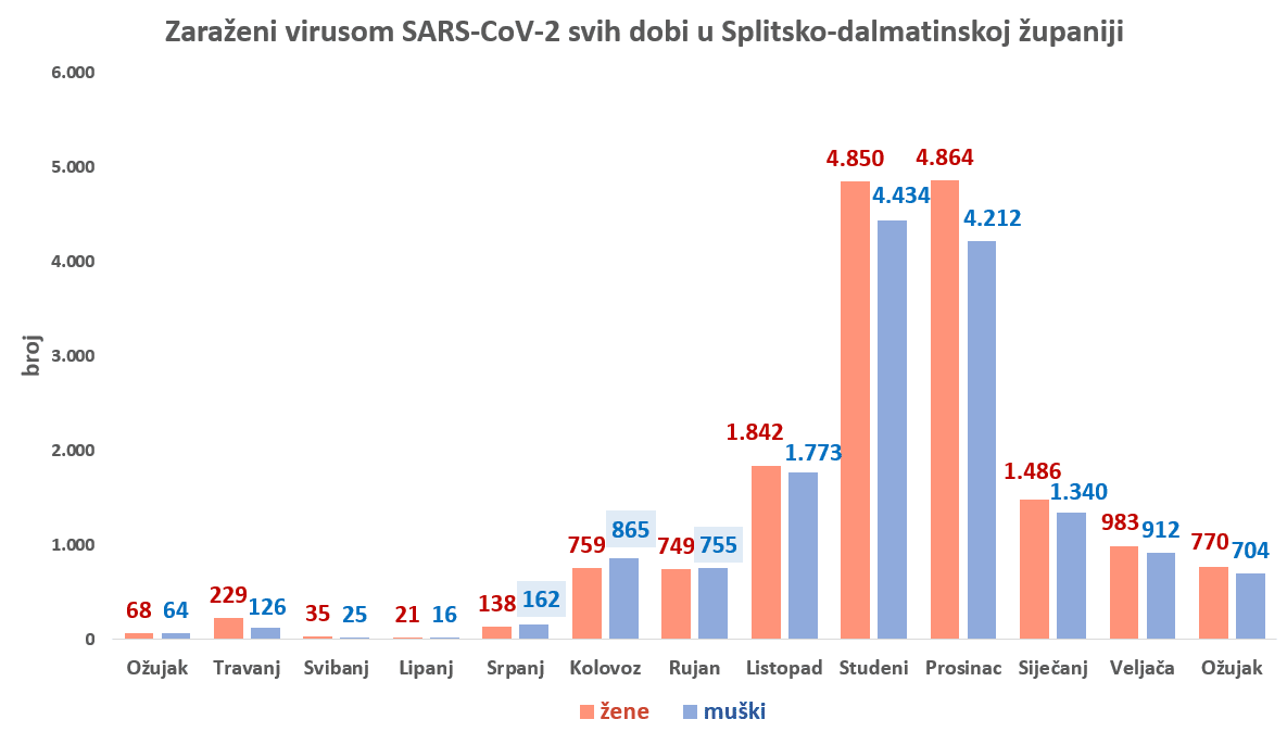Spolna raspodjela zaraženih koronom po mjesecima pokazuje da je veći broj zaraženih ženskog spola u svim mjesecima osim u ljetnim mjesecima srpanj-rujan kada je bilo više zaraženih muškaraca.