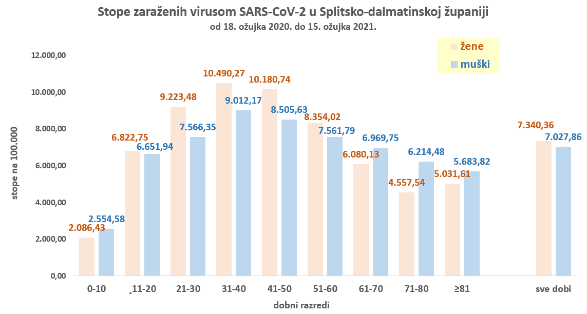 U svim dobnim razredima stope zaražavanja žena su veće u odnosu na muškarce koji veće stope imaju u najmlađem dobnor razredu do 10 godina i najstarijim dobnim razredima 60 i više godina.