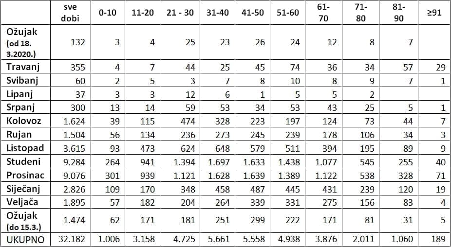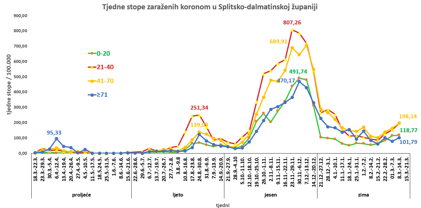 Kraj kalendarske zime, posljednja dva tjedna veljače i prva dva tjedna ožujka, obilježeni su povećanjem stopa zaraženosti u svim dobnim skupinama osim najstarijoj gdje je prisutno smanjenje u pojedinim tjednima. Opet je najveće povećanje u radno sposobnim skupinama.