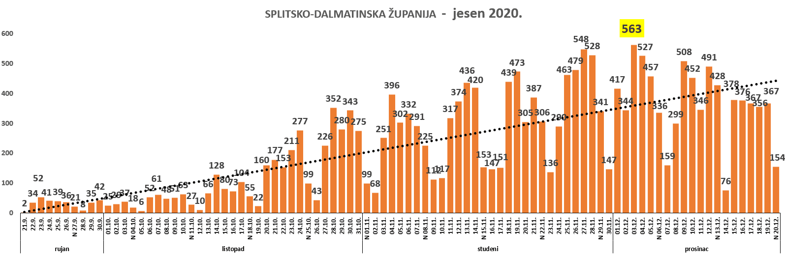 U nadolazećem jesenjem godišnjem dobu nastavio se očekivani trend povećanja zaraženih korona virusom. Vrhunac zaražavanja je 3. prosinca s registriranih 563 zaraženih korona virusom. Do kraja jeseni ukupno je zaraženo 20.295 građana SDŽ - 63,17 %. Umrlo je 218 ili 46,0% od svih umrlih.