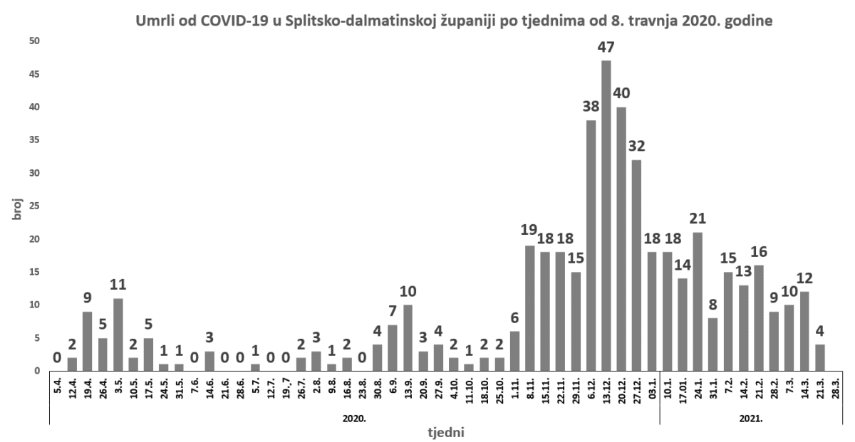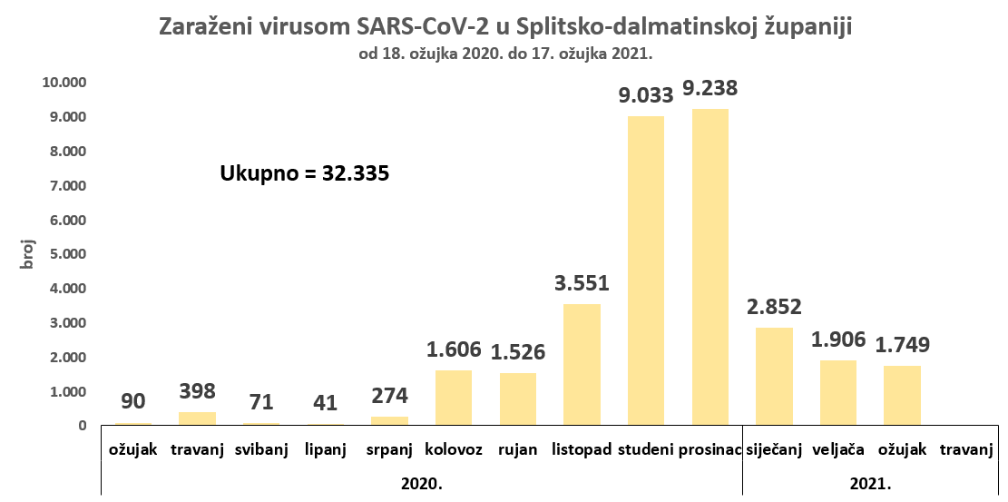 Od ukupnog broja 32.182 zaražena stanovnika SDŽ kroz čitavu godinu u proljetnom razdoblju svega je bilo njih 1,80 %, a umrlih 39 na ukupno 474 umrla u cijeloj godini – udio 8,23 %.