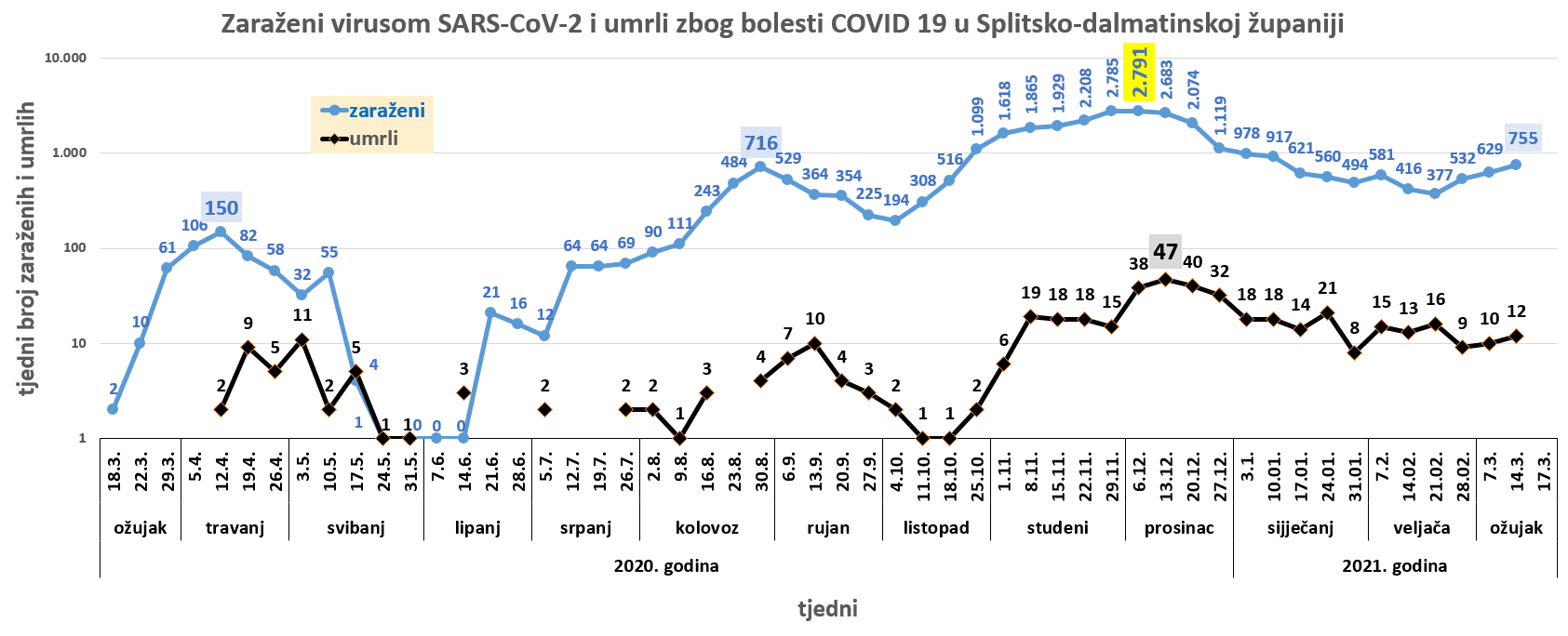 Usporedni logaritamski dijagrami zaraženih i umrlih po tjednima u SDŽ pokazuju da je vrhunac zaražavanja bio u tjednu do 6. prosinca 2.791 zaraženih, a umrlih 47 u tjednu do 13. prosinca. Višetjedni stalni trend smanjivanja broja zaraženih i umrlih prekinut je posljednji tjedan veljače. U prvim tjednima ožujka 2021. nastavljen je trend povećanja broja zaraženih, a time i umrlih što se pripisuje pojavi brzoširećih sojeva virusa SARS-CoV-2. Premda ti virusi ne izazivaju veću smrtnost, ipak veći broj bolesnika ugrožava uspješnije liječenje.