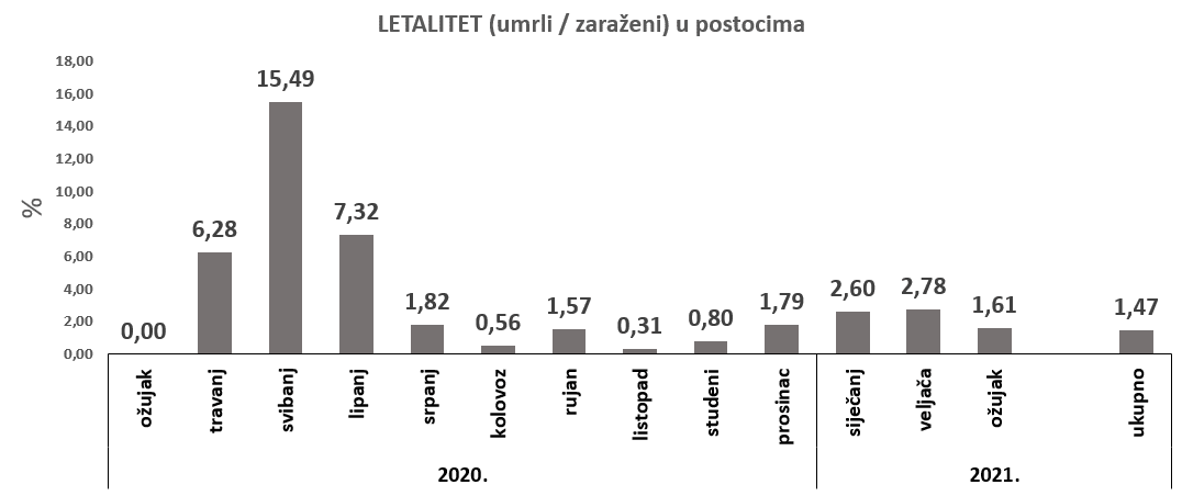 Veći udjeli umrlih na broj zaraženih (letalitet) u mjesecima travanj-lipanj 2020. posljedica su oboljelih od COVID-19 starijih dobi u odnosu na oboljele u jeseni i zimi.