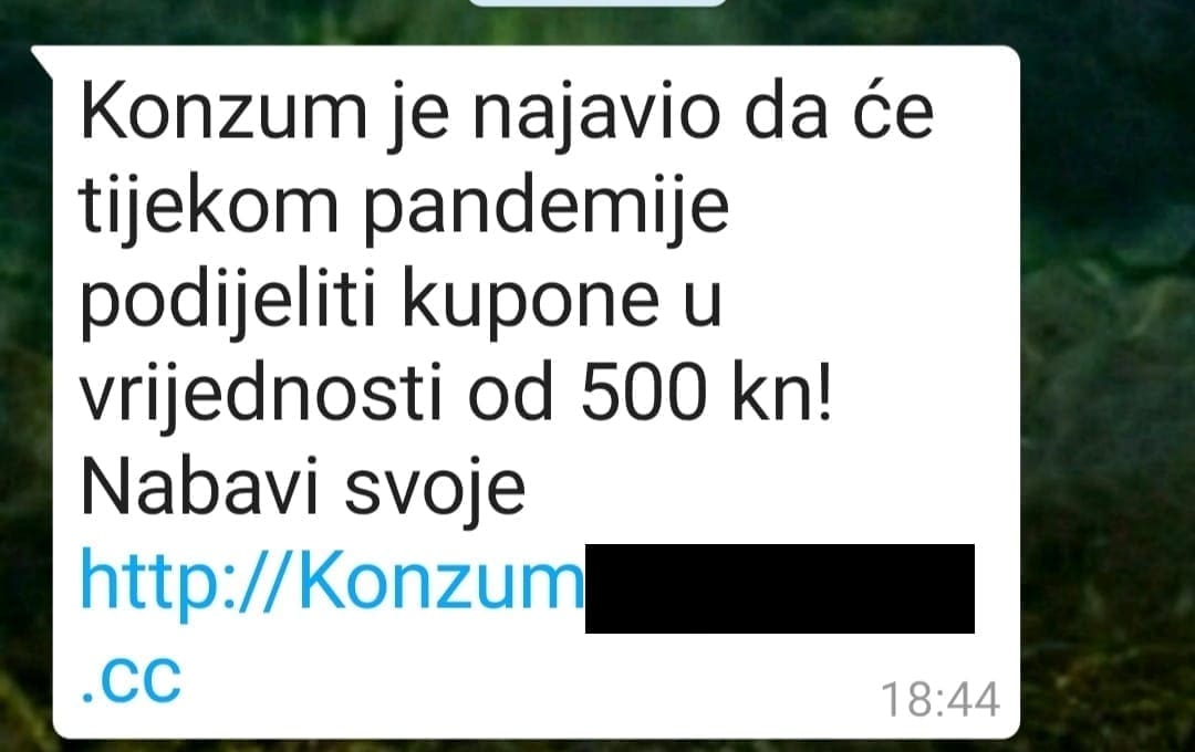 Naime, korisnicima pristižu poruke u kojima stoji da Konzum dijeli besplatne kupone. Uz to se šalje i poveznica na web stranicu.