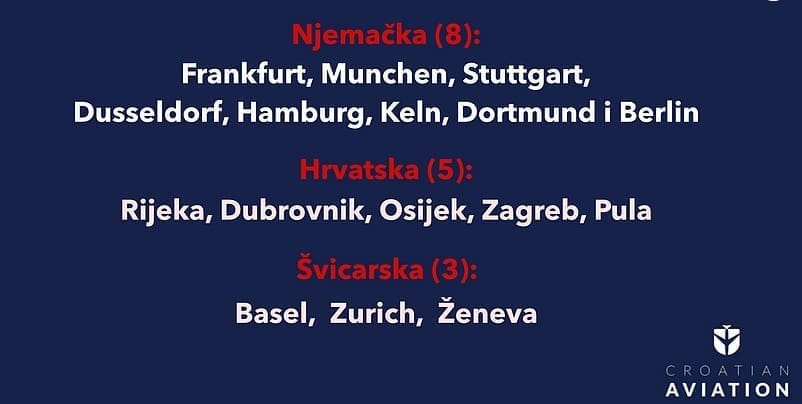 Najveći broj odredišta iz Splita imat će Croatia Airlines, od čega su dva domaća i četiri međunarodna. Naime, do navedenog datuma Croatia Airlines će iz Splita prometovati prema Zagrebu, Osijeku, Frankfurtu, Rimu, Munchenu i Zurichu. Sve linije su već u prometu, osim linije Split - Zurich - Split na kojoj će Croatia Airlines prvi let ove sezone obaviti u subotu, 22. svibnja.
