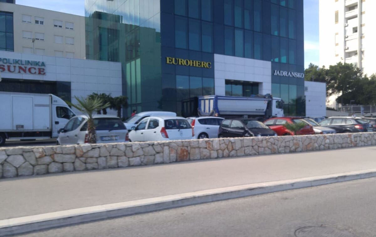 Jutros su pred zgradu Euroherc osiguranja u Varaždinskoj ulici parkirana dva kamiona tvrtke Bešlić. Jednim je blokiran ulaz u zgradu, a drugim u garažu.