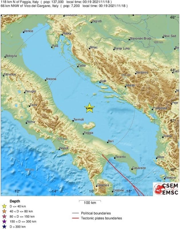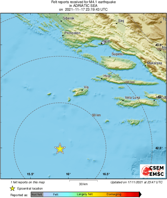 Prema podacima EMSC-a, magnituda potresa je iznosila 4.1 prema Richteru, a epicentar je bio 70 kilometara južno od Visa.
