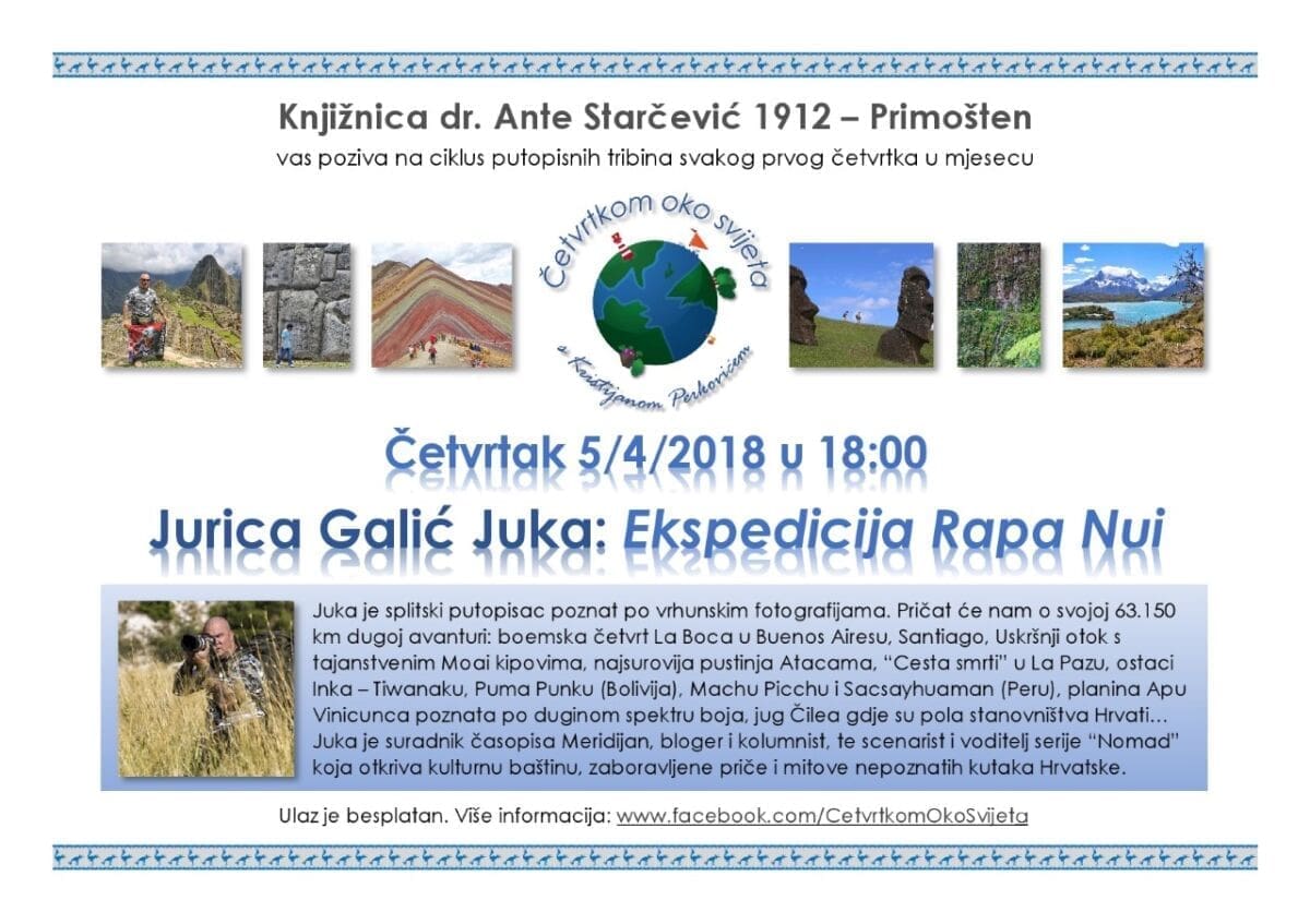 U knjižnici Primošten svakog prvog četvrtka u mjesecu održava se ciklus putopisnih tribina "Četvrtkom oko svijeta". Poznate hrvatske putopisce i avanturiste ugošćuje Kristijan Perković, koji će ovog četvrtka primoštenskoj publici predstaviti splitskog putopisca i fotografa Juricu Galića Juku.