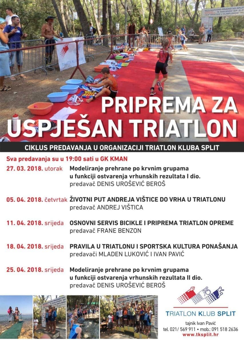 Triatlon klub Split slijedećih mjesec dana organizira niz predavanja s tematikom priprema za uspješno završavanje triatlona. Govorit će se o prehrani sportaša, o tehničkim stvarima i pravilima, a svoju triatlonsku priču ispričat će i uspješni svjetski triatlonac Andrej Vištica.