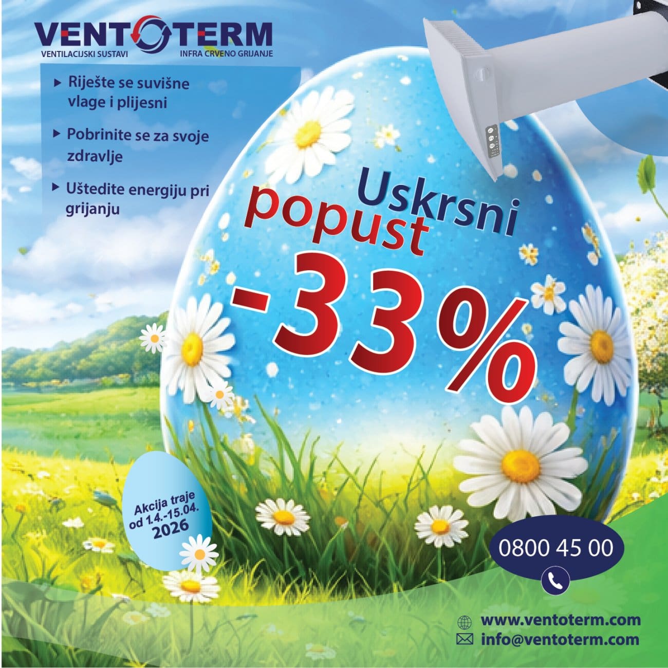 Iskoristite uskršnju akciju od čak – 33 % do 15.4. I javite se za besplatnu ponudu I izvid u cijeloj HR. Za više informacija posjetite: www.ventoterm.com ili nazovite 0800 45 00.