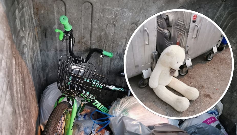 Čitateljica iz Splita nam se požalila na sramotne prizore na koje je naišla u Splitu. Naime, na redakcijski mail (info@dalmacijadanas.hr) poslala je fotografije koje prikazuju neoštećeni bickl u kontejneru za smeće. Na istom mjestu, pored kontejnera su ostavljene i plišane igračke.