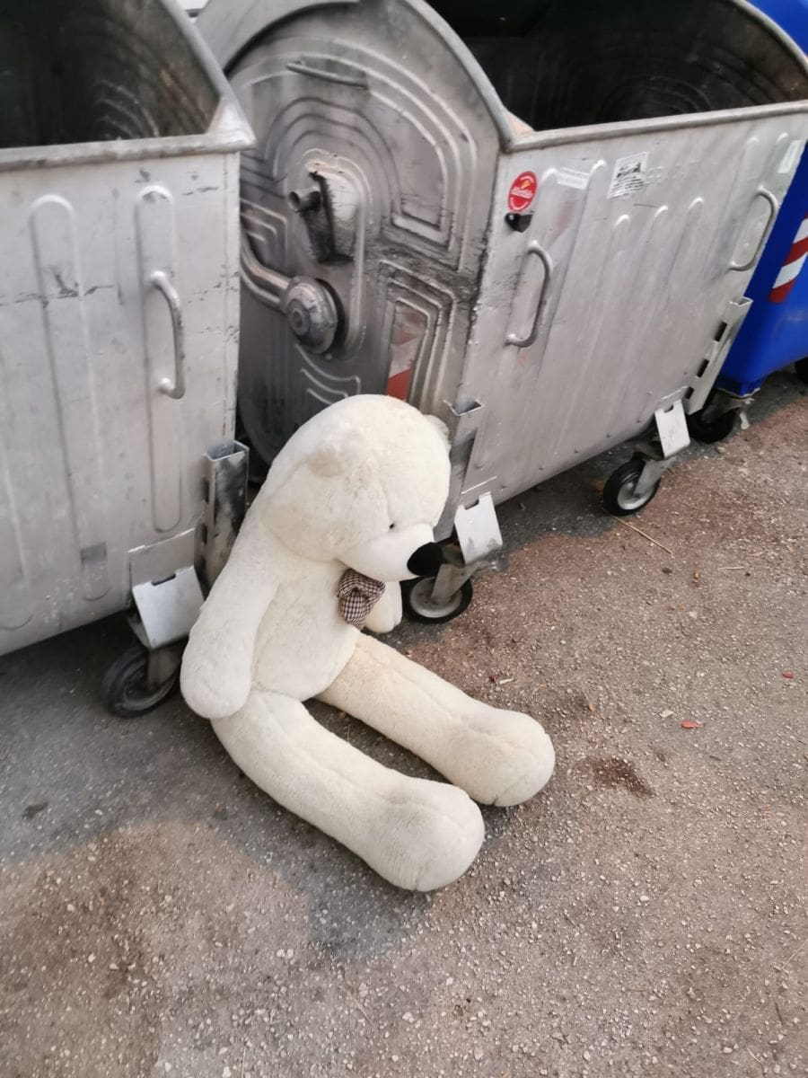 Na istom mjestu pored kontejnera ostavljen je i plišani medvjedić. Umjesto u novom domu nekog djeteta čiji si roditelji ne mogu priuštiti kupovinu igračka, ovom plišancu je novi dom - smeće.