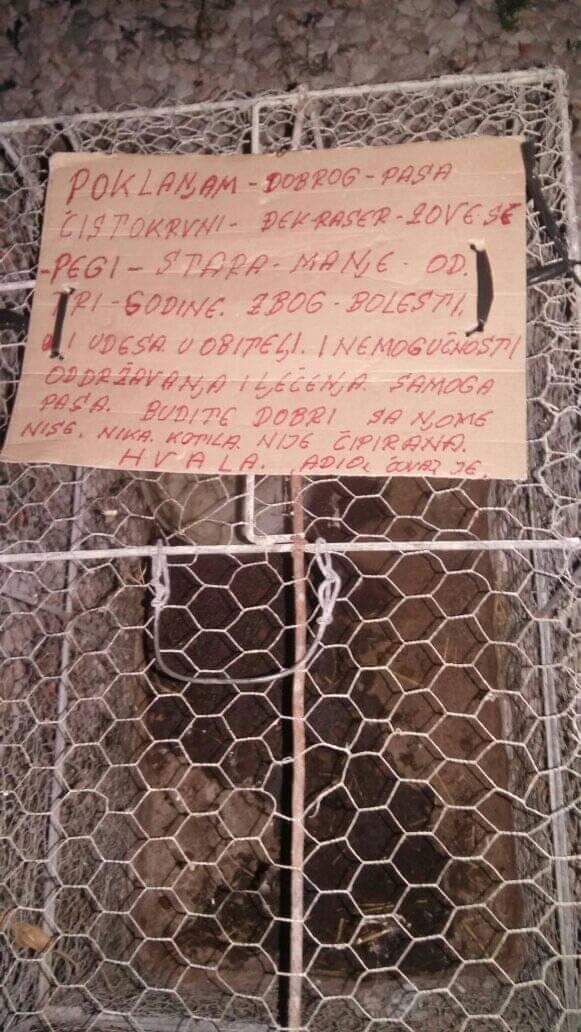 Nepoznata osoba ostavila je psa u kavezu s porukom: "Poklanjam dobrog psa. Čistokrvni jack russel. Zove se Pegi. Stara manje od tri godine. Zbog bolesti i udesa u obitelji. I nemogućnosti održavanja i liječenja samoga psa. Budite dobri sa njom. Nije se nikad kotila i nije čipirana. Čuvaj se."