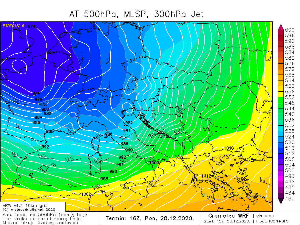 Snažna i prostrana ciklona s centrom iznad zapadne Europe snažno je utjecala na vrijeme tijekom ponedjeljka na cijelom Jadranu. U Dalmaciji je veći dio dana puhalo jako jugo s olujnim udarima. Navečer je jugo okrenulo na oštro, zatim i na lebić. Tada su u Splitu službeno zabilježeni orkanski udari do 122 km/h, na Crometeo mjernoj postaji Zvjezdano selo Mosor izmjereni su udari do 140 km/h.