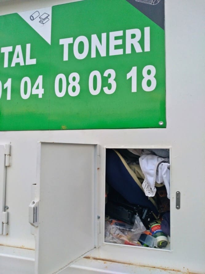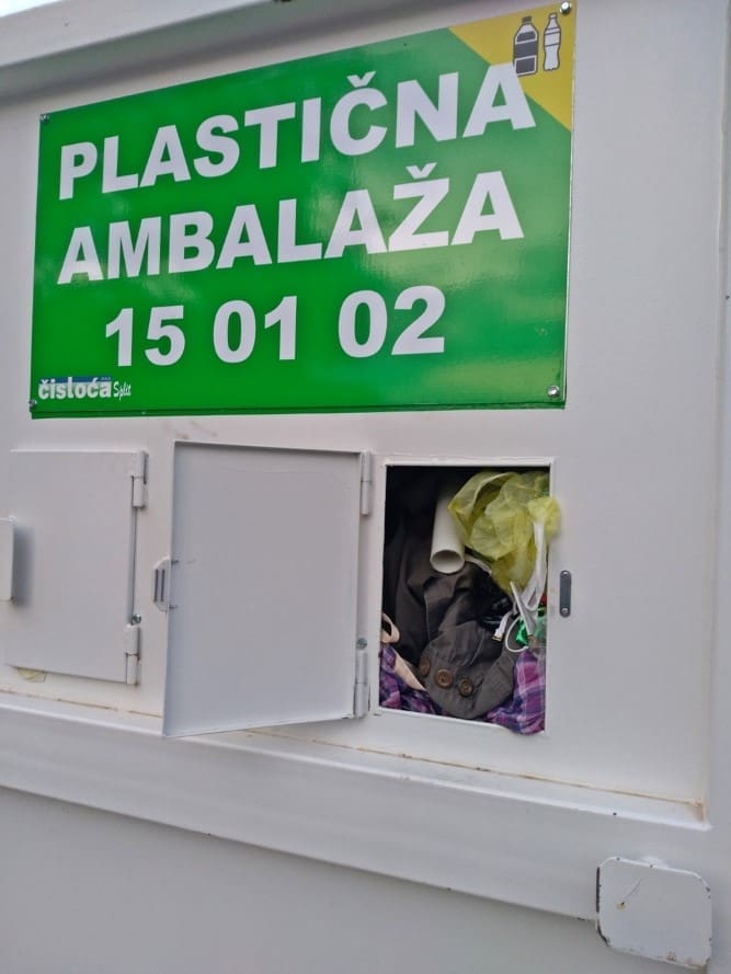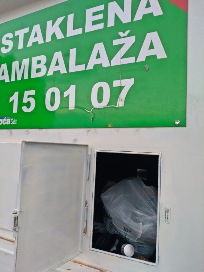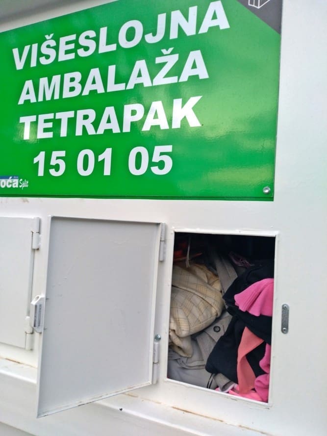 -Prva šaka u oko - solidna gomilica vreća i vrećica s (pretpostavljam) odjećom, na podu uz sami kontejner. Znači, taj odjeljak je krcat, sva sreća da nisam ponijela svoje "krpice", ne bih ih imala gdje odložiti. Nema veze, mislim se, za moje tetrapake i staklenu ambalažu bit će mjesta, prozorčići su uredno zatvoreni... aha, kako ne! Iz svakog "odjeljka" kipte komadi odjeće, samo što ne ispadaju. Kako? Zašto? Šta je sad ovo? - zapitala se kada je vidjela da je sve zapravo izmiješano.