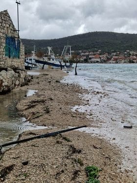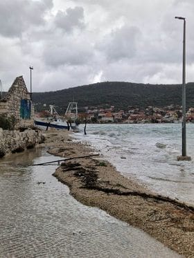 Uslijed jakog nevremena, ogromne količine pijeska i žala jugo je izbacilo s plaže na put uz rivu i time zapriječilo prolaz automobilima (iako su neki pokušali prijeći preko, završili su neslavno pa se rukama gurao automobil da se iskopa iz šljunka), ali zadalo probleme i pješacima. I taj problem traje, vjerovali ili ne, već treći dan.