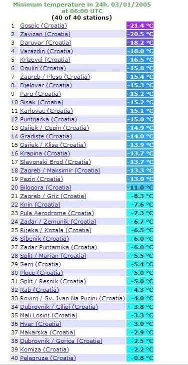Siže nam velika hladnoća, nema nikakve sumnje, najhladniji dio dosadašnjeg tijeka zime. Još se sjećamo siječnja 2017. godina, kada je dijelove Dalmacije pogodila najjača zimska hladnoća zadnjih 30 do 50 godina. Nadolazeći hladni val bit će barem jednako hladan kao spomenuti iz siječnja 2017., a postoji mogućnost da ponegdje bude i hladniji. Sljedećeg tjedna u unutrašnjosti zemlje minimalne temperature padat će na vrijednosti od -15 do -20 Celzijevih stupnjeva. Mraz stiže posvuda na Jadranu, uključujući sve otoke, pa i one vanjske! Najhladnije razdoblje bit će od utorka do petka. Najniže temperature na obalnom dijelu Dalmacije bit će od -9°C na zadarskom području do -5°C na dubrovačkom, od -13°C na kninskom do -1°C na Palagruži. U spomenutom razdoblju u Zagori ni najviše dnevne temperature neće prelaziti nulu, a cjelodnevni minus dogodit će se i na dijelu obale.