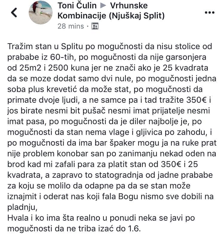 Zanimljiv oglas iz Splita osvanuo je danas u grupi Vrhunske kombinacije (Njuškaj Split). Autor oglasa, Toni Čulin, kazao nam je da se nije šalio nego je jednostavno isfrustriran na kakve je sve odgovore i situacije naišao u posljednje vrijeme tražeći stan u Splitu.