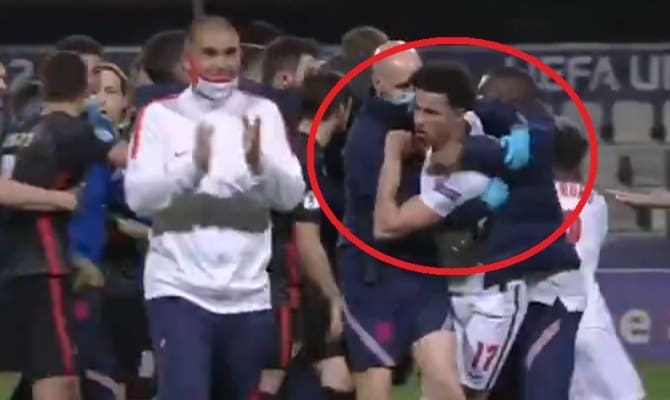 Igrač Liverpoola Curtis Jones, inače velik talent engleskog nogometa, uhvaćen je na kamerama kako se odmah nakon kraja utakmice zaletio na hrvatske nogometaše. Srećom, njegovi suigrači su imali hladnije glave, obuzdali su ga i spriječili da situacija eskalira.