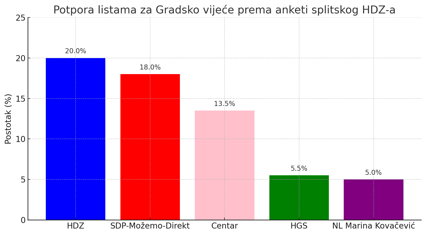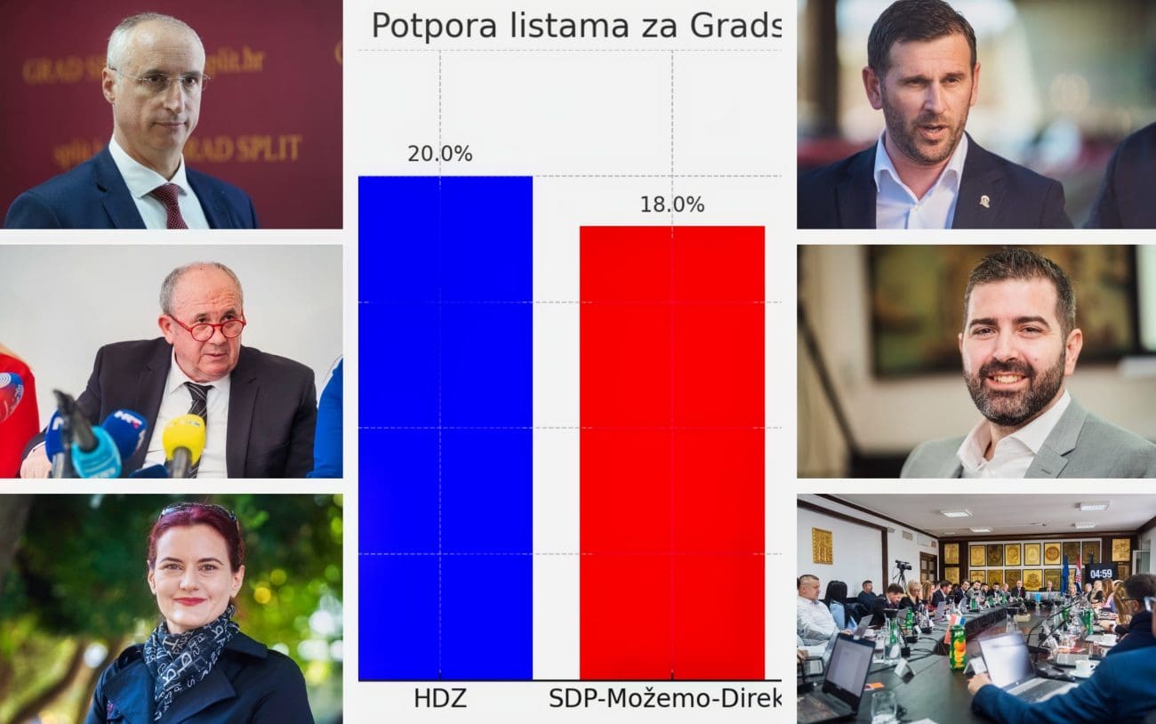 Što se tiče Gradskog vijeća HDZ bi imao relativnu većinu jer sada uživa 20 posto potpore, koalicija SDP-Možemo-Direkt je na 18 posto, Centar je na 13,5 posto, Kerumov HGS na 5,5, a prag prelazi i NL Marine Kovačević.