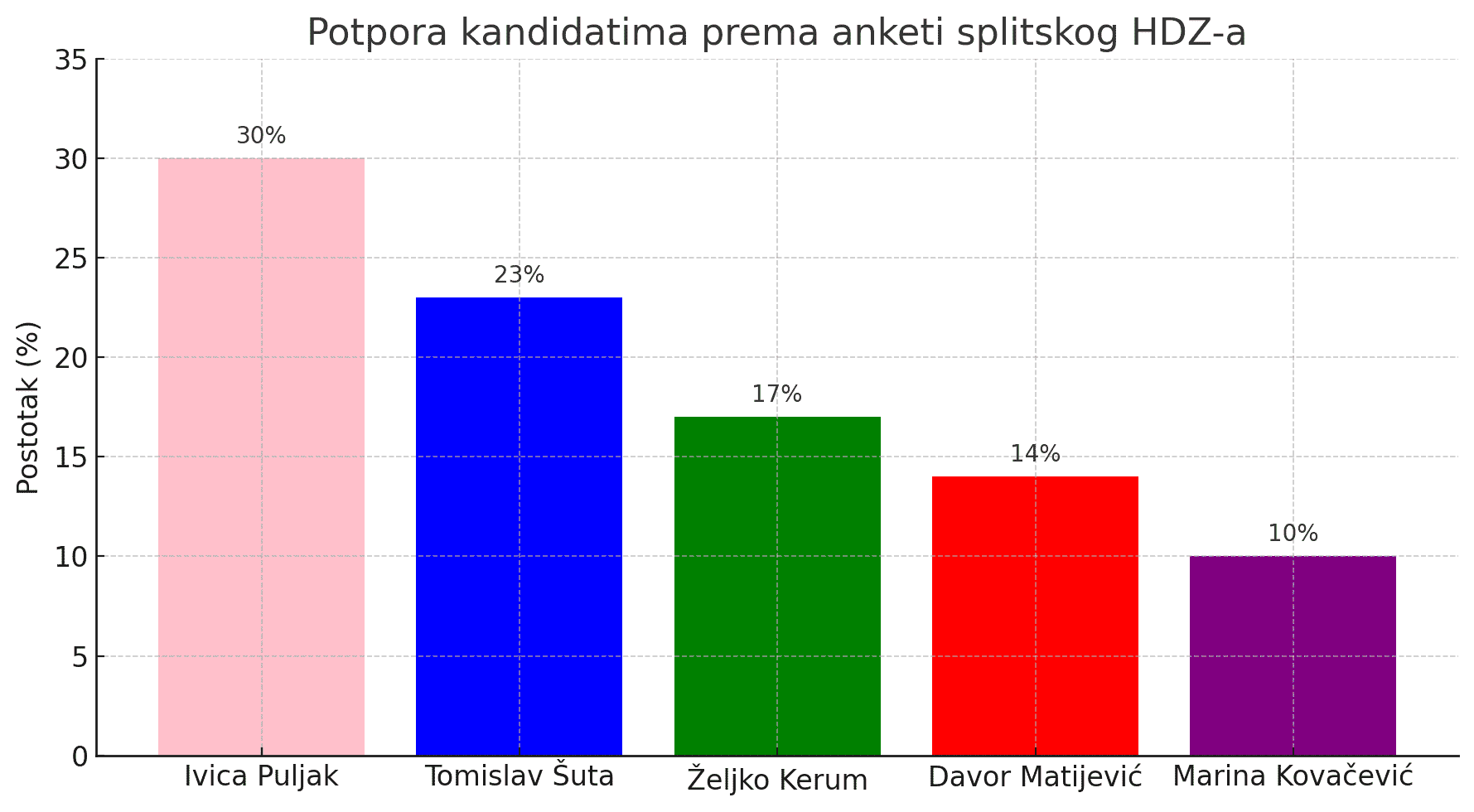 Prema anketi koju je naručio splitski HDZ, Puljak ima 30 posto potpore, a Šuta visokih 23 posto. Kerum je treći sa 17 posto, a Matijević četvrti s 14 posto. Svojevrsno iznenađenje je nezavisna Marina Kovačević s čak desetak posto potpore.