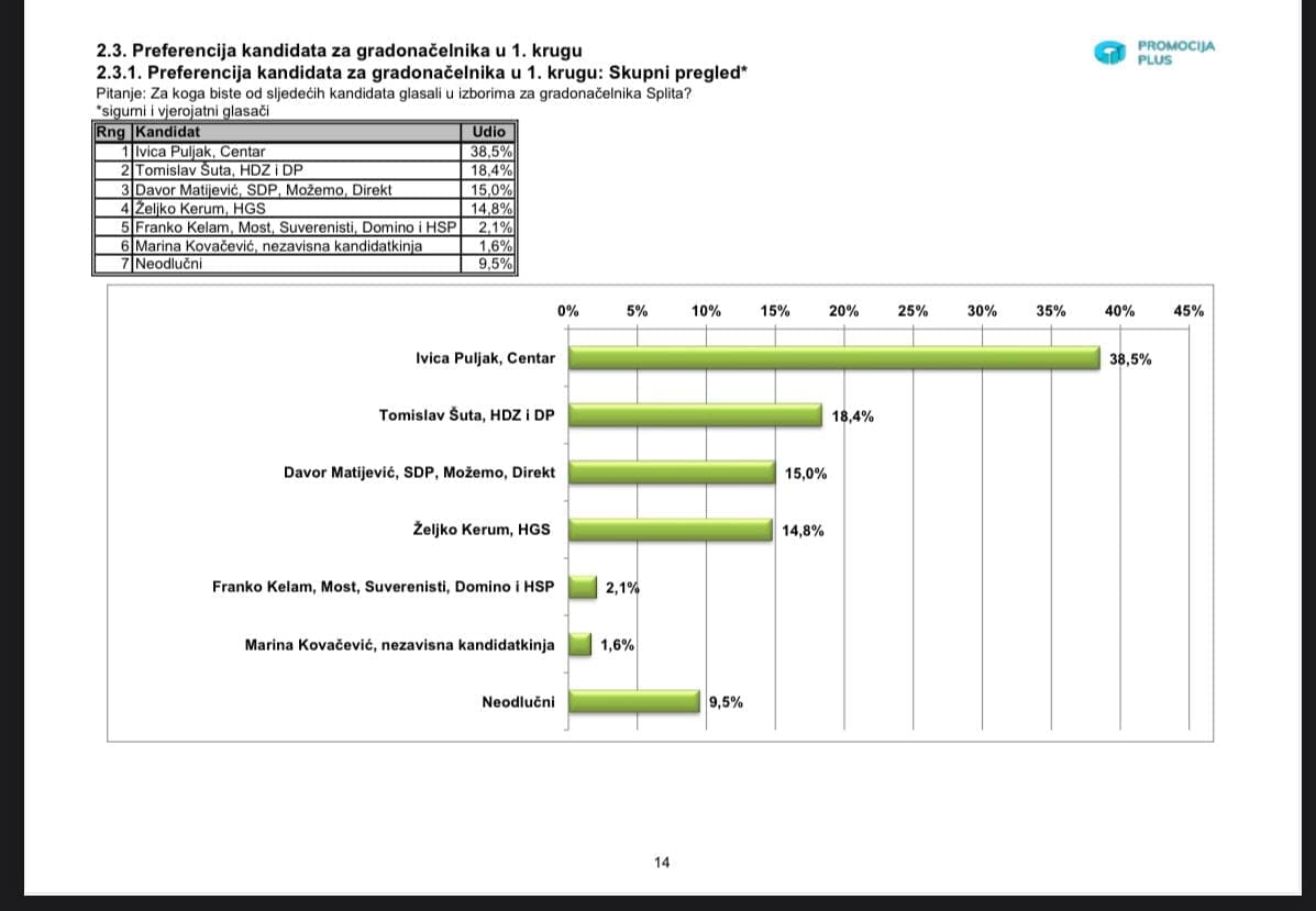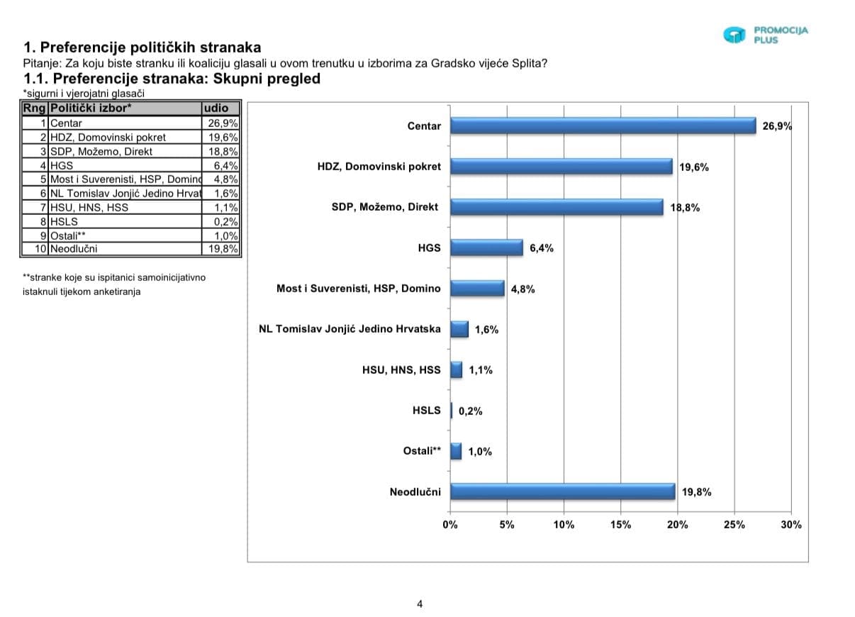 Istraživanje koje je agencija Promocija Plus provela za splitski SDP pokazuje da bi, kad bi se izbori za Gradsko vijeće održali danas, prag od pet posto preskočile samo četiri liste. Centar Ivice Puljka osvaja 26,9 posto potpore sigurnih i vjerojatnih glasača, HDZ–Domovinski pokret slijedi sa 19,6 posto, koalicija SDP–Možemo–Direkt dobiva 18,8 posto, dok bi HGS Željka Keruma ostao na 6,4 posto. Most, Suverenisti, HSP i Domino, iako peta snaga u anketi, sa 4,8 posto ostaju ispod izbornog praga, kao i NL Tomislava Jonjića, NL Marine Kovačević itd. Ipak, bitno je naglasiti da su zbog velikog broja neodlučnih birača moguća veća iznenađenja i znatna odstupanja od ove ankete.