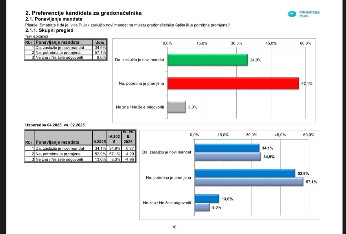 Na pitanje smatraju li da aktualni gradonačelnik Ivica Puljak zaslužuje novi mandat, 34,9 posto ispitanika odgovara potvrdno, dok 57,1 posto drži da je Splitu potrebna promjena na vrhu Banovine. U odnosu na veljaču broj onih koji zazivaju promjenu narastao je za oko četiri postotna boda, a udio neodlučnih pao je na svega osam posto.