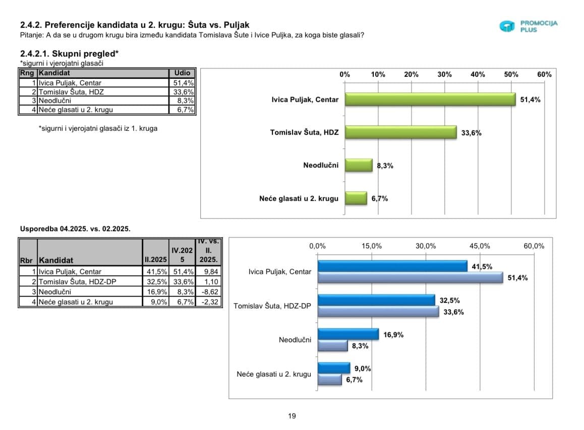 - Puljak vs. Šuta – 51,4 : 33,6 posto; neodlučnih 8,3 posto, a 6,7 posto ispitanika tvrdi da ne bi glasovalo.