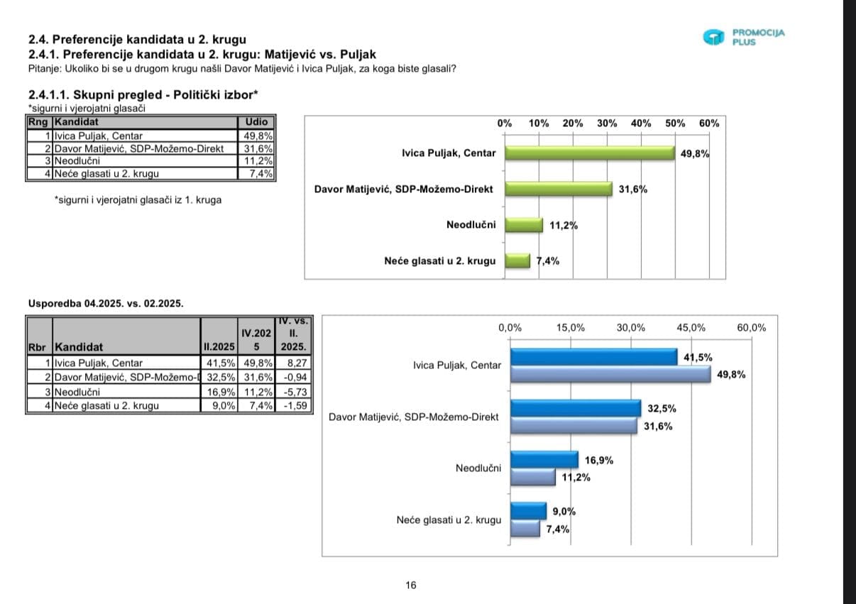 - Puljak vs. Matijević – 49,8 : 31,6 posto; neodlučnih 11,2 posto, dok 7,4 posto najavljuje apstinenciju.