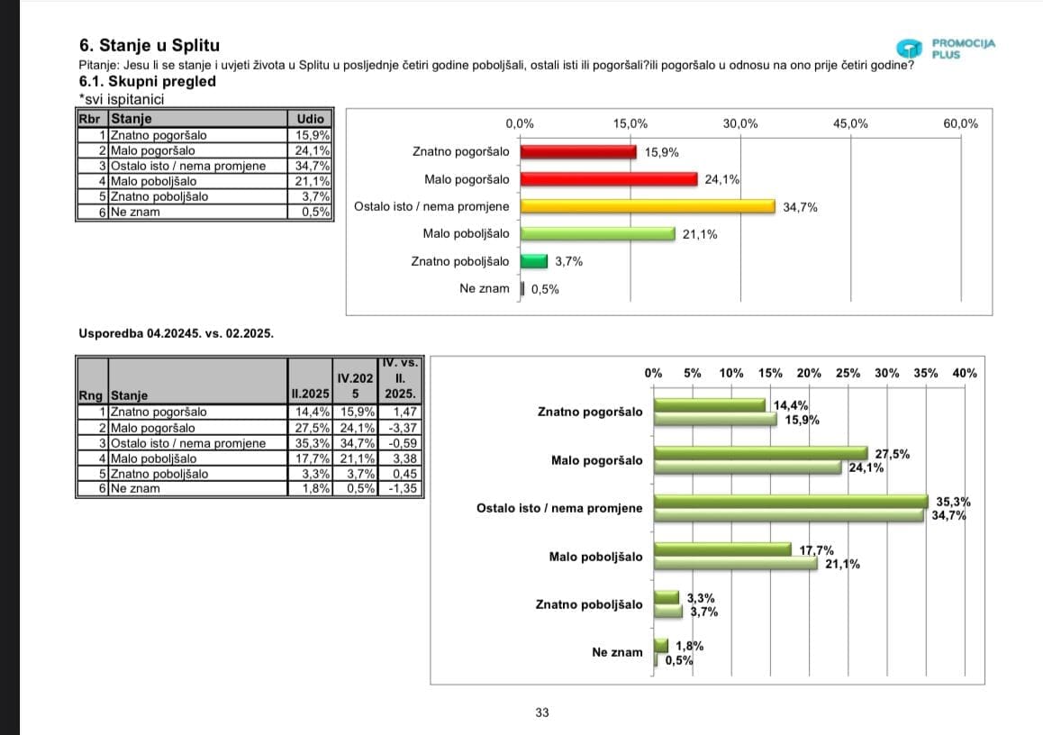 Na kraju, ispitanici procjenjuju kako se kvaliteta života u Splitu tijekom posljednje četiri godine nije promijenila (34,7 posto) ili se malo pogoršala (24,1 posto). Još 15,9 posto smatra da se stanje znatno pogoršalo. S druge strane, poboljšanje (malo ili znatno) bilježi ukupno 24,8 posto građana. Ti brojevi sugeriraju da birači vide ograničen domet dosadašnjih reformsko-investicijskih zahvata gradske uprave, što djelomično objašnjava i većinsku želju za promjenom na čelu grada.