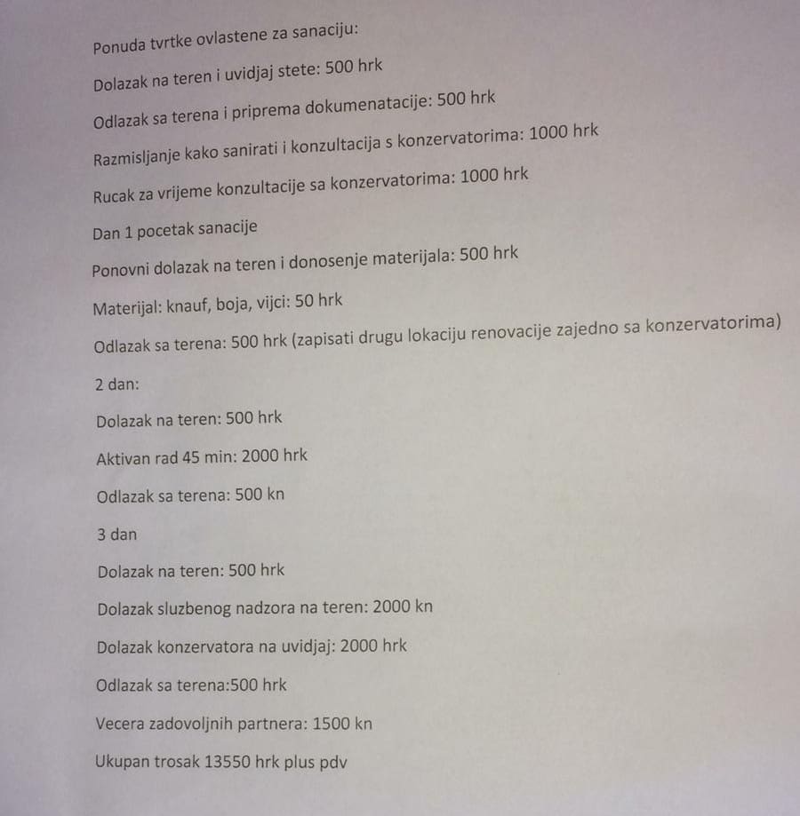 Uspjeli smo doći do "troškovnika" koje je ponudila anonimna firma ovlaštena za sanaciju gradske jezgre i grupa stanara koja je obavila sanaciju.