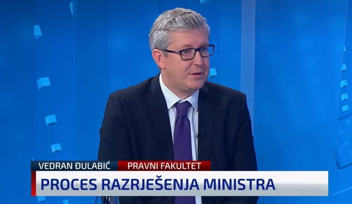 Profesor s Pravnog fakulteta u Zagrebu Vedran Đulabić u Newsroomu s Domagojem Novokmetom upozorio je da predsjednik Vlade Andrej Plenković nije razriješio Marija Banožića s mjesta ministra obrane sukladno važećim propisima. Predsjednik prema Ustavu RH i važećim propisima niti imenuje niti smjenjuje ministre, kaže Đulabić.