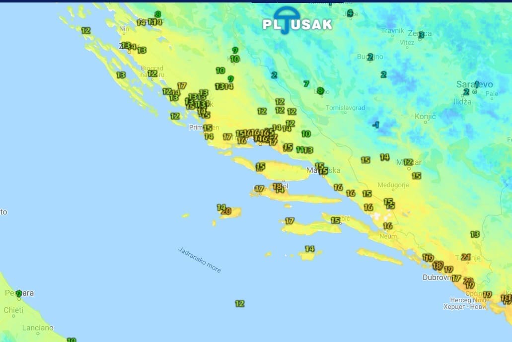 Utorak je najtopliji dan dosadašnjeg tijeka godine u Dalmaciji. Slaba do umjerena bura otjerala je oblake pa je danas prevladavalo vedro vrijeme sa znatno višim temperaturama zraka od prosjeka za ovaj dio godine.