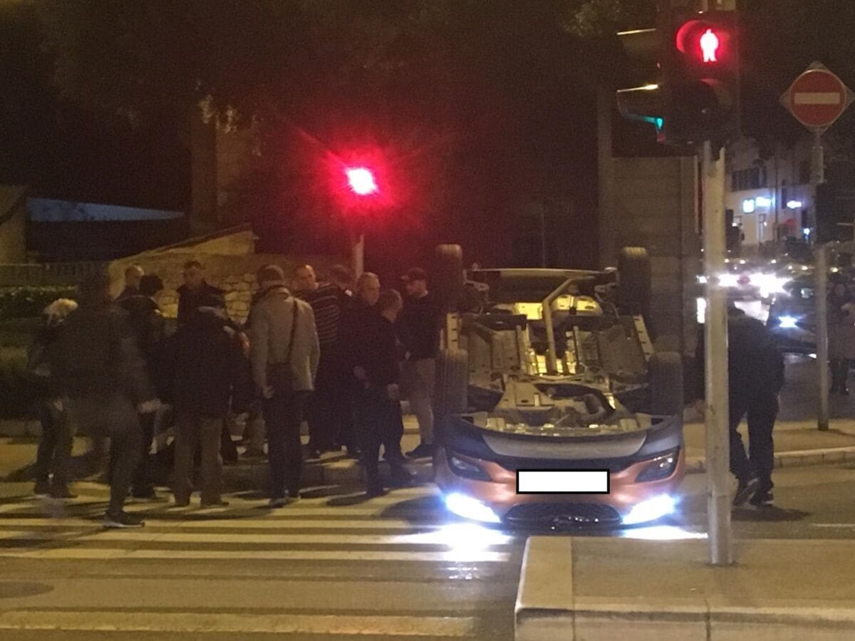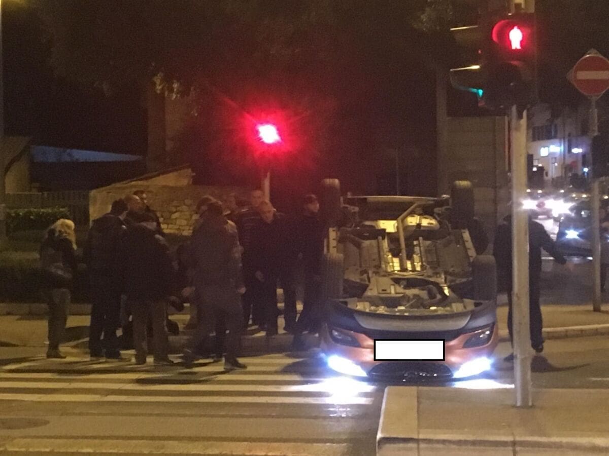 Oko 17 sati i 45 minuta došlo je do prometne nesreće na križanju ulice Slobode i kralja Zvonimira, kraj Gradske knjižnice Marko Marulić, u kojoj je došlo do prevrtanja automobila na krov. U prometnoj nesreći su sudjelovala dva osobna automobila.