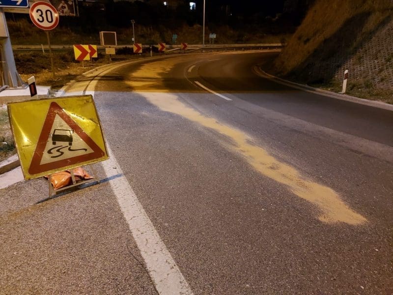 Policijski službenici preusmjeravaju vozila na staru Klišku cestu dok se ne uklone tragovi nafte s ceste.