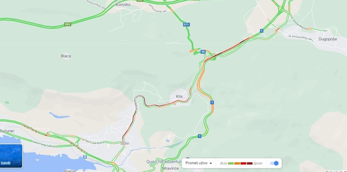Da promet teče usporeno na dijelu brze, ali i stare Kliške ceste, ukazuje Google procjena prometa.
