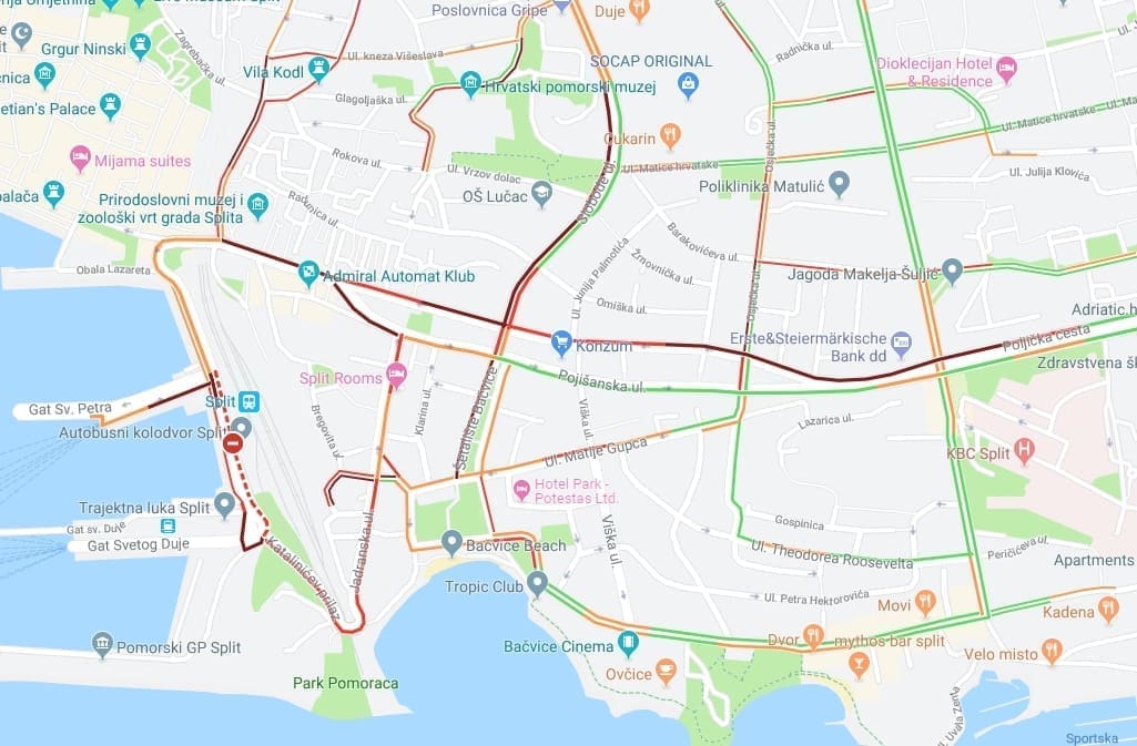 Prometni čep vidljiv je i na Google traffic aplikaciji koja prikazuje potpunu blokadu od Trajektne luke do raskrižja kod KBC Firule.