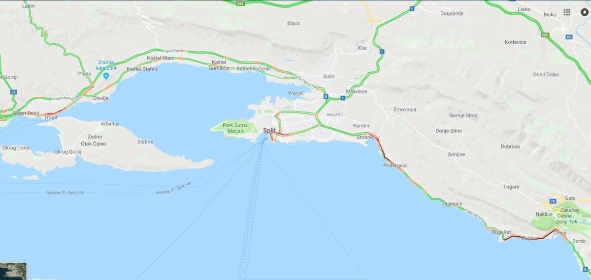 Sve veće gužve vladaju na Jadranskoj magistrali od Splita do Stobreča. Kolona se stvara u smjeru Splita od hotela Sunce u Podstrani do skretanja za Žrnovnicu.