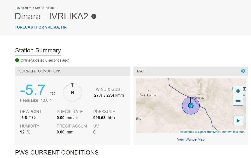 Najhladnija lokacija u Hrvatskoj je Sinjal na Dinari sa -7°C, a na Velikoj Duvjakuši je -6°C uz osjet hladnoće od -14°C. Tamo će uvjeti vrlo uskoro postati još ekstremniji jer će očekuje daljnji pad temperature, ali i naglo jačanje bure koja će večeras biti olujna. Bura će kasnije večeras podno Biokova, Velebita, a možda i drugdje, imati orkanske udare.