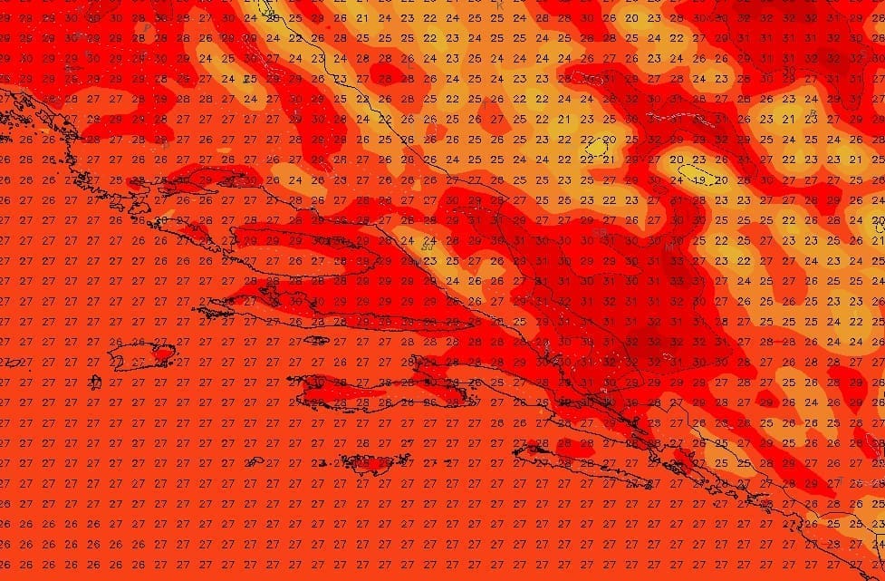 Bližimo se sredini rujna, a ugođaj je i dalje pravi ljetni, baš kao da je kolovoz. Tako su i jučer temperature zraka u velikom dijelu Dalmacije prelazile 30°C, a Knin je bio najtopliji s čak 33°C. More je i dalje iznimno toplo za dio godine, površinske temperature u našem dijelu Jadrana su mu većinom od 23 do 26°C.