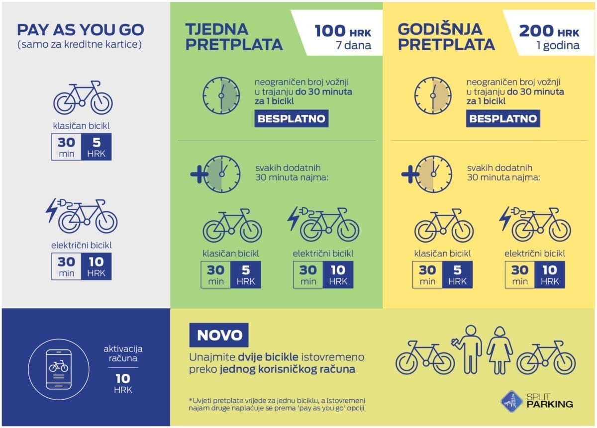 Ono što je važno napomenuti je da cijena sezonske pretplate ostaje nepromijenjena te i dalje iznosi 200 kuna za 365 dana, jedino će se sada ona u sustavu preimenovati u 'godišnja pretplata'. Korisnici njome, kako je bilo i do sada, ostvaruju neograničen broj besplatnih vožnji do 30 minuta, a cijena za svakih dodatnih pola sata iznosi 5kn za klasične te 10 kuna za električne bicikle.