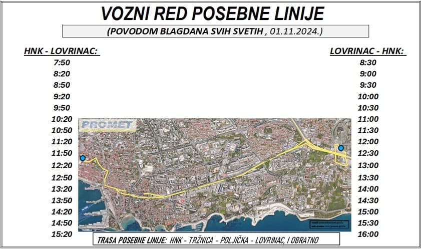 Trasa navedene privremene linije bit će: HNK - tržnica - Poljička cesta - Lovrinac, te povratak istom trasom u obrnutom smjeru, a na navedenoj trasi koristit će se sva usputna autobusna stajališta.