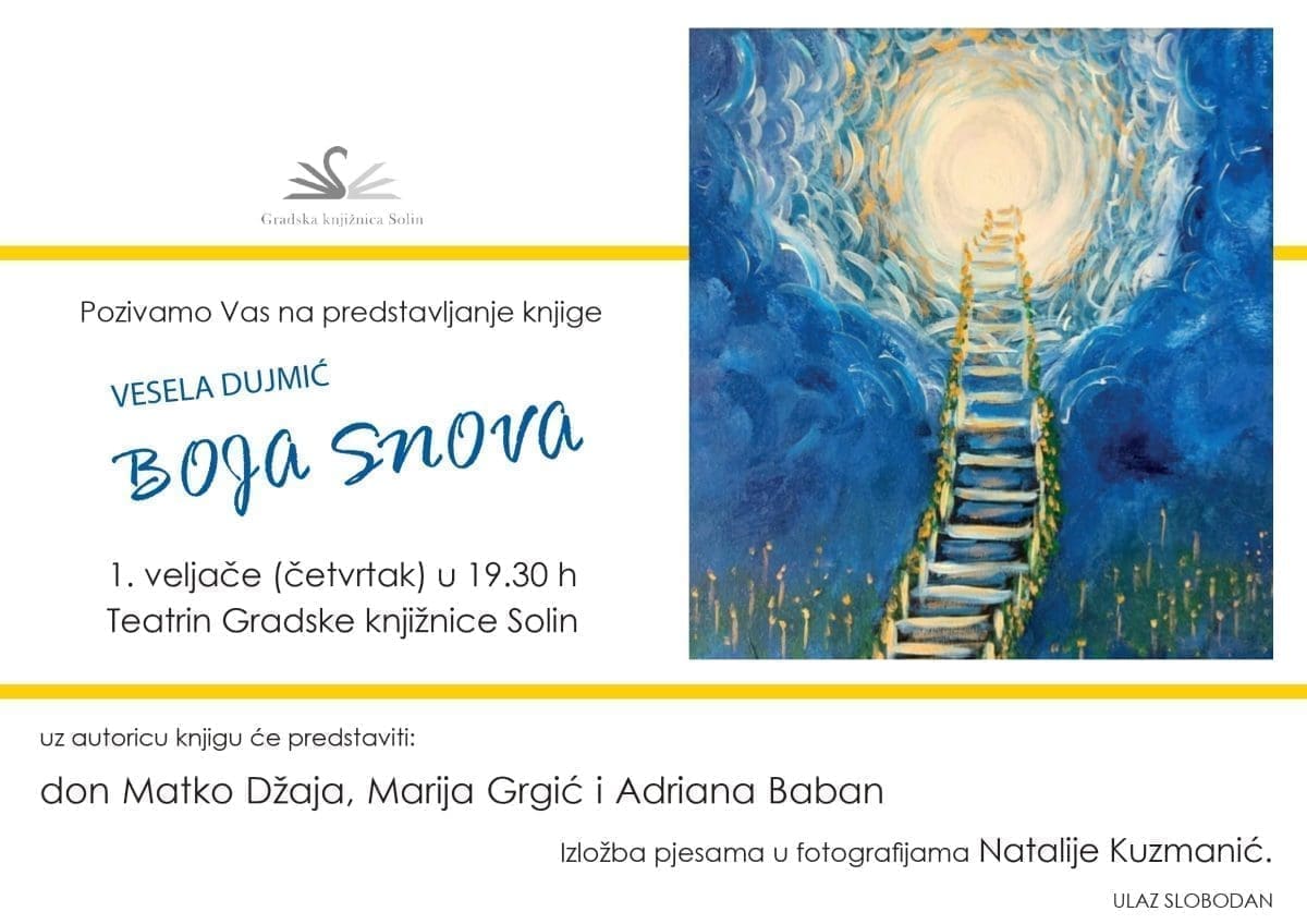 Gradska knjižnica Solin poziva na promociju zbirke poezije "Boja snova" Vesele Dujmić koja će se održati u Teatrinu GK Solin u četvrtak, 1. veljače s početkom u 19 sati.