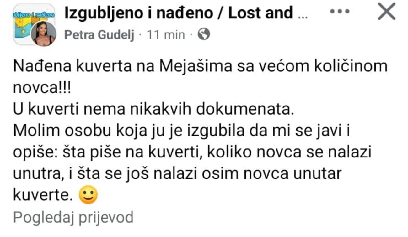 “Nađena kuverta na Mejašima s većom količinom novca! U kuverti nema nikakvih dokumenata. Molim osobu koja ju je izgubila da mi se javi i opiše: što piše na kuverti, koliko novca je unutra i što se još, osim novca, nalazi u njoj", napisala je.