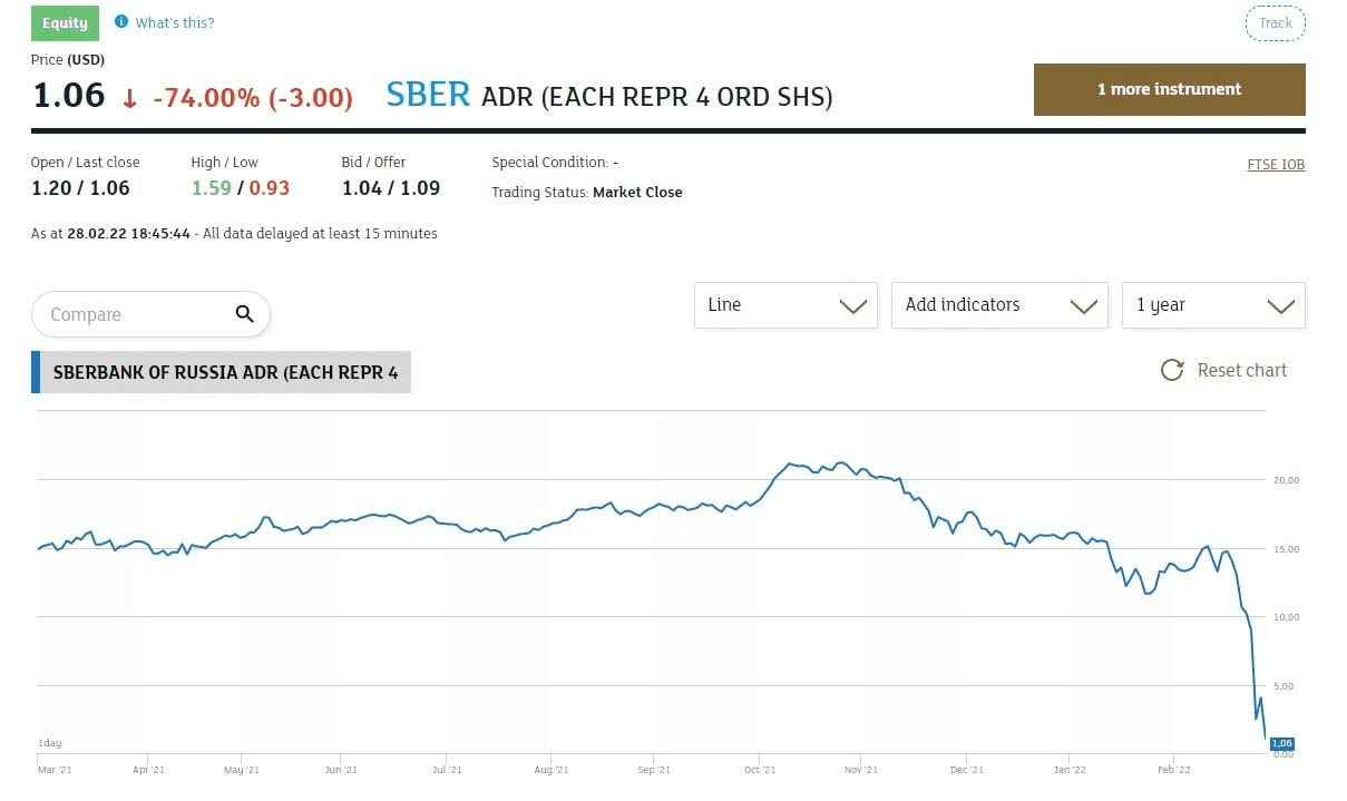 U 2022. je Sberbank ušao s cijenom od 16 dolara po dionici, a još 16.2.2022. je iznosila 14.76 dolara, nakon čega slijedi vrtoglavi pad na trenutnih 1.06 dolara (na datum 28.2.).