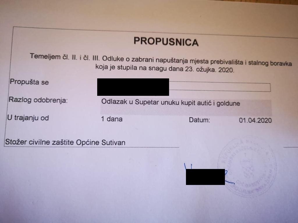 Kao razlog odobrenja je navedeno: "Odlazak u Supetar unuku kupit autić i goldune". S obzirom na to da naznačeni datum 1.4.2020. puno toga postaje jasnije....