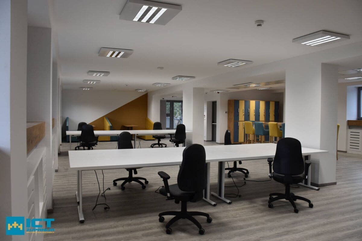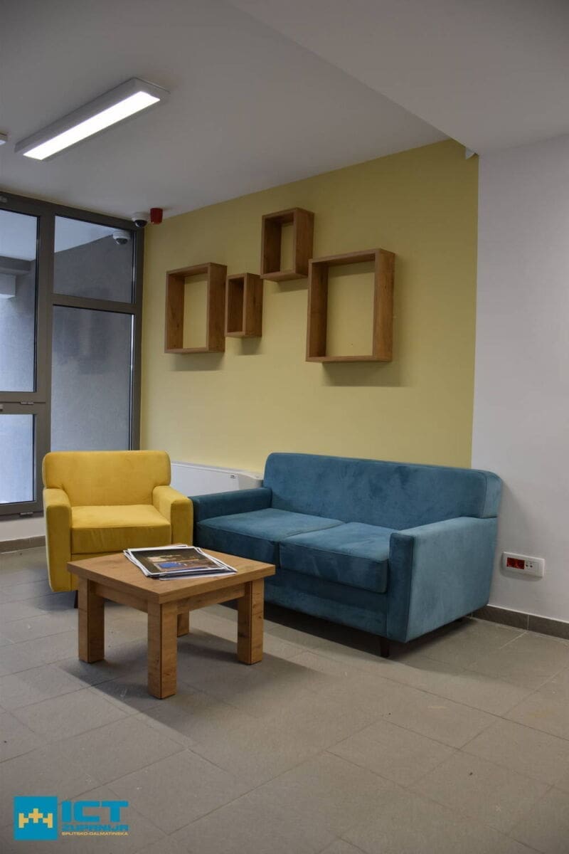 Na prvom katu se nalaze uredski prostori sa salama za sastanke i coworking salama različitih veličina. Od osam, deset, 12 radnih mjesta. Svaki kat ima jedan prostor za opuštanje s čajnom kuhinjom. Zanimljivo je što su uredi modularni – mogu se prilagoditi veličini timova koji će se useliti u njih. Tehnološki park je spojen na T-com, Carnet, u prizemlju će se nalaziti i biljar i stolni nogomet. A na prvom katu će se naći čak i - teretana. Naravno, tu su i svlačionice s ormarićima, tuševima…