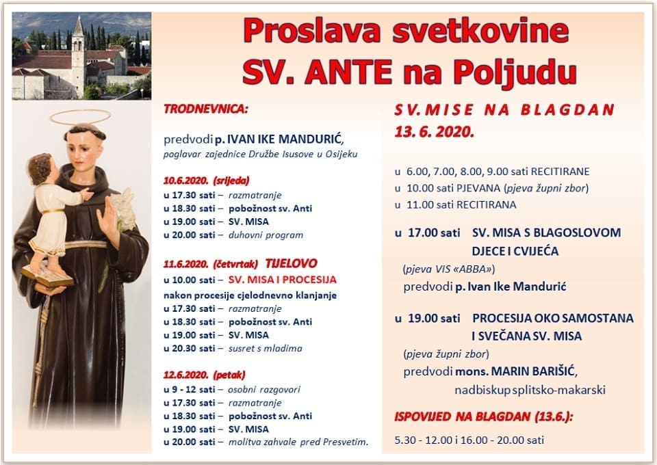 Proslava svetkovine sv. Ante u istoimenom samostanu u Splitu na Poljudu održat će se u subotu 13. lipnja. Svečano euharistijsko slavlje s procesijom, u 19 sati, predvodi splitsko-makarski nadbiskup mons. Marin Barišić. Misu u 17 sati s blagoslovom djece i cvijeća predvodi p. Ivan Ike Mandurić. Svete mise se slave i u: 6, 7, 8, 9, 10 i 11 sati.