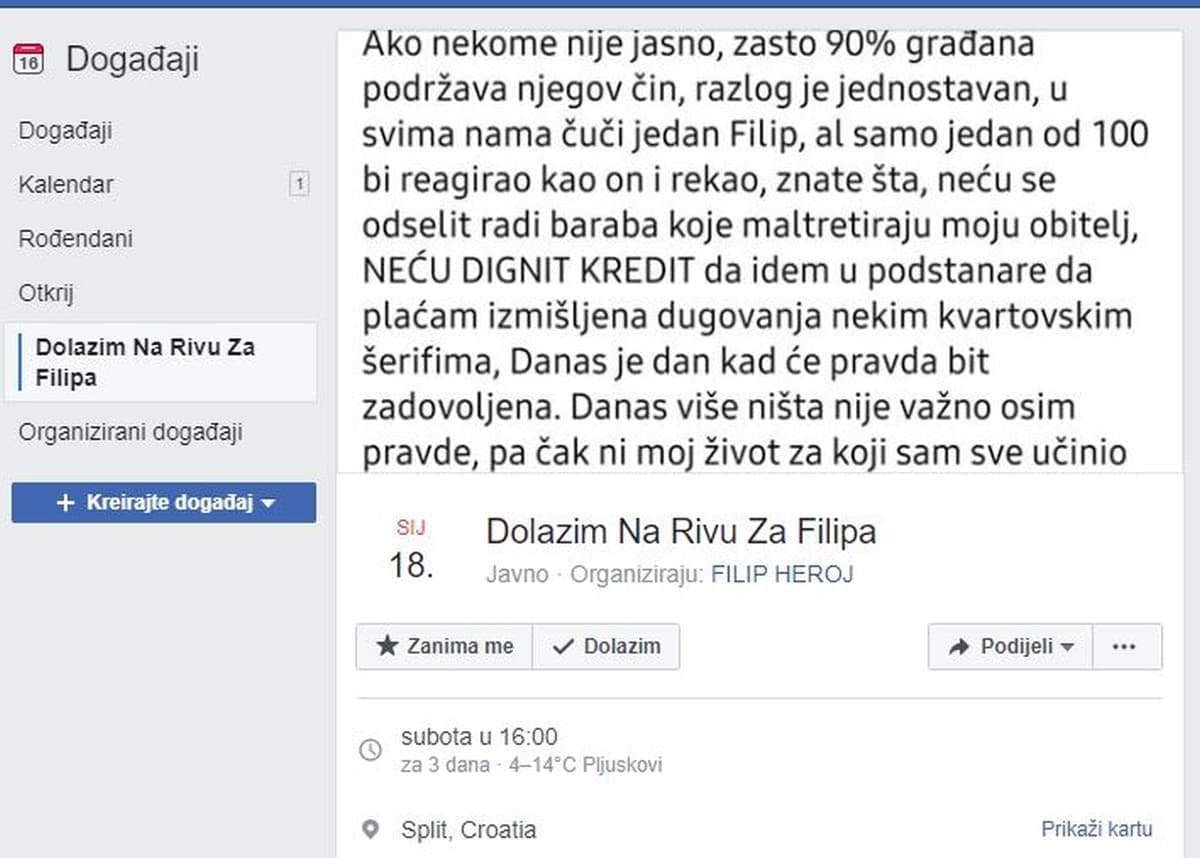 'Dolazim Na Rivu Za Filipa' naziv je događaja koji je kreirala spomenuta grupa, a u opisu događaja između ostalog piše: "Ako nekome nije jasno zašto 90% građana podržava njegov čin, razlog je jednostavan, u svima nama čuči jedan Filip..."